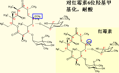 是对红霉素 C 一 6 位羟基甲基化后的产物。6 位羟基甲基化以后,使红霉素 C-9 羰基无法形成半缩酮而增加其在酸中的稳定性。克拉霉素耐酸 , 血药浓度高而持久。