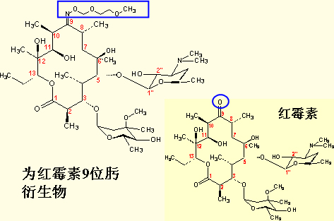 结构特点:罗红霉素是红霉素C-9肟的衍生物,可阻止6位羟基与9位羰基的缩合,增加稳定性。明显改善药物的口服生物利用度。