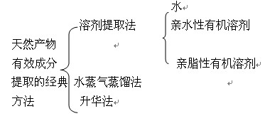 经典的提取方法有:溶剂法、水蒸气蒸馏法、升华法。现在有一些新的提取方法,如:微波提取法,超声提取法,仿生和半仿生提取法 超临界流体萃取法。