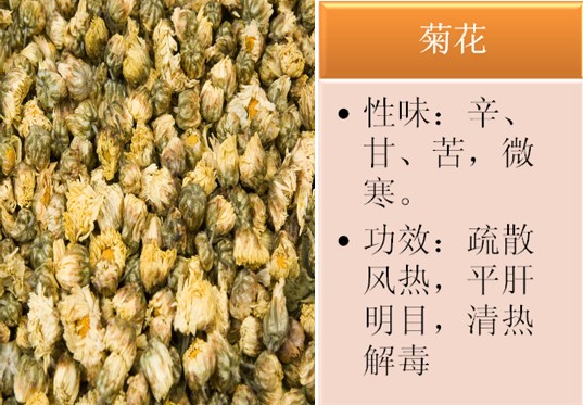 菊花――性味辛、甘、苦,微寒。功效疏散风热,平肝明目,清热解毒。疏散清降并能,故一药呈现二向性。